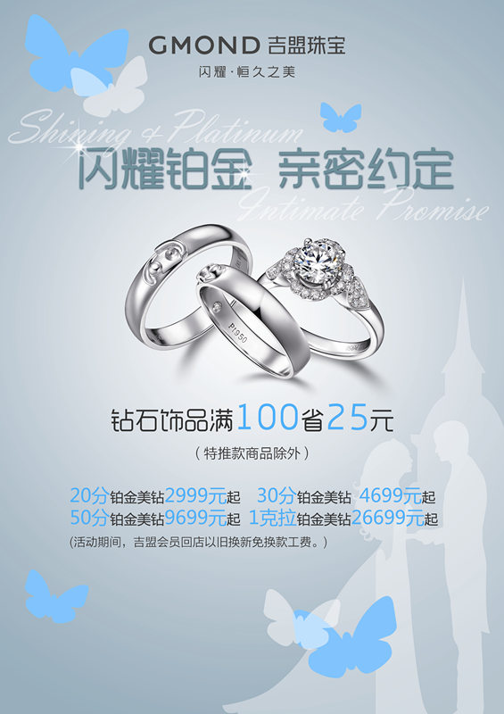 除此之外,9月20日下午2点,GMOND吉盟珠宝还将推出由GMOND吉盟珠宝携手《时尚新娘》杂志和国际铂金协会联合举办的闪耀铂金亲密约定婚享会活动。活动现场不但有数款至臻美钻闪耀亮相,同时还请到GMOND吉盟珠宝资深设计师和时尚新娘资深珠宝编辑来到活动现场为即将步入婚姻殿堂的新人们讲述吉盟珠宝背后的故事和婚戒挑选方式,现场还将邀请到身穿华美婚纱的时尚模特演绎珠宝搭配,更有精彩互动和精美大礼包,期待你的参加。